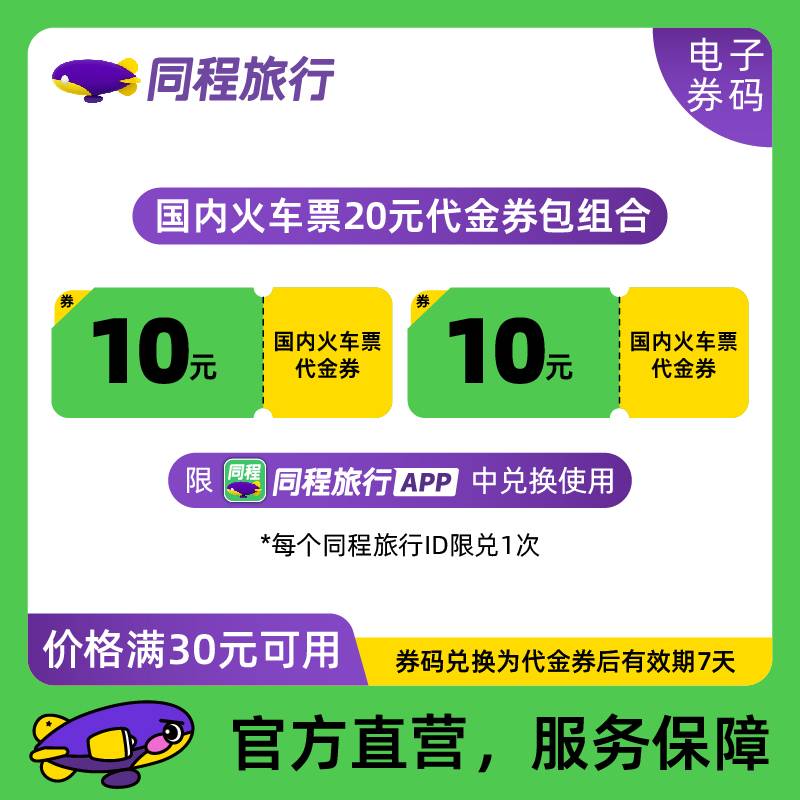 【自动充值】同程旅行火车票立减券30-10元2张